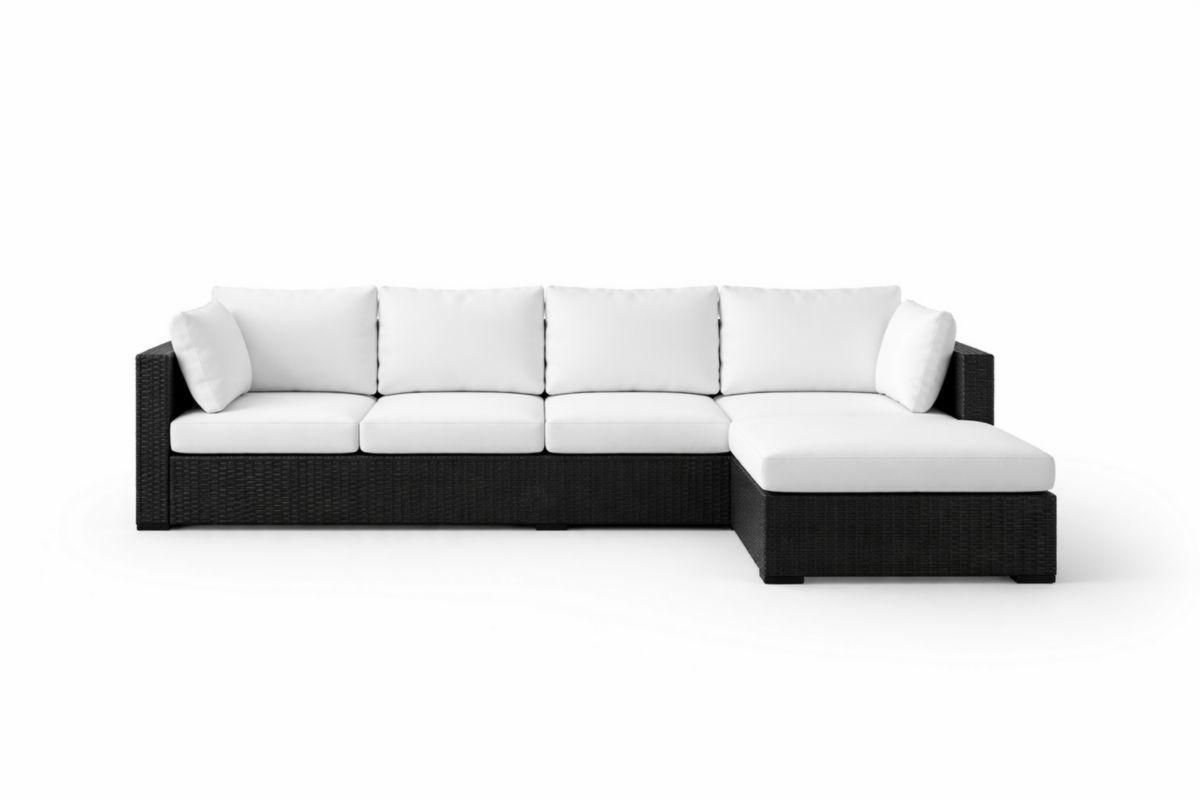 Divano angolare composto da rattan sintetico con cuscini in poliestere. Il colore è Bianco e Nero. Le dimensioni del divano sono 308 cm di lunghezza, 155 cm di larghezza e 63 cm di altezza.