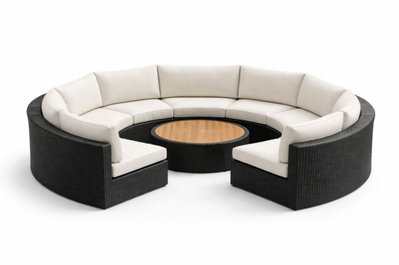 La struttura del divano è realizzata in rattan sintetico altamente resistente agli agenti atmosferici ed è progettata con nove sedute dalla forma curva.