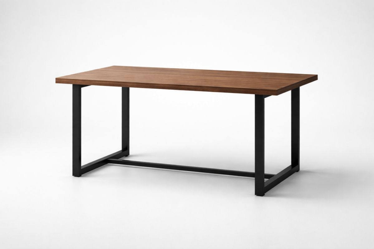 Questo tavolo rettangolare presenta un piano in legno di noce e una struttura in metallo nero. Misura 150 cm di lunghezza, 75 cm di larghezza e 75 cm di altezza. Ha una superficie liscia ed è caratterizzato da gambe rettangolari. Il tavolo ha una capacità di carico di 100 kg.